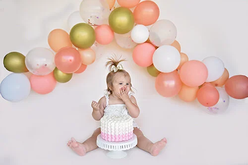 Cake smash sessions typically last about 45 minutes if baby is loving the cake. We will start with some pre pictures ( I suggest a different outfit from the cake smash outfit ) and then go to the cake smash. We will also take a few pre pictures in the cake smash outfit. If baby is loving the cake I typically will get the shots we need (10-15 minutes) and then call it quits. Reason is it's a lot of sugar for your little one and I don't want them to have an upset tummy. We will let baby set the pace of the smash. Some littles dig right in and destroy it, some need a little bit of help, and some just won't stop eating the cake. Just be ready to get your own hands dirty to help them smash if they need it.